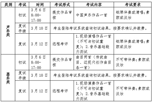 1.音樂學(xué)(音樂國際教育與傳播)專業(yè)考生須參加學(xué)校組織的線上考試。考試滿分為750分,其中初試滿分為300分、復(fù)試滿分為450分(作品唱奏400分;音樂基礎(chǔ)能力測試50分,含視唱練耳和樂理)。