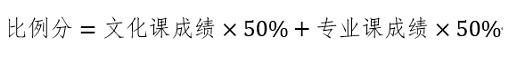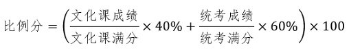 在實(shí)行平行志愿的省份,按照投檔成績從高到低的順序擇優(yōu)錄取。在實(shí)行順序志愿的省份,按照比例分(四舍五入、保留小數(shù)點(diǎn)后兩位)從高到低的順序擇優(yōu)錄取。比例分滿分為100分,計(jì)算公式為: