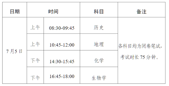 2025年夏季合格考考試時間為7月5日,開考4個科目,分別是歷史、地理、化學、生物學,各科目均為閉卷筆試,考試時長75分鐘。具體時間和科目詳見附件1。