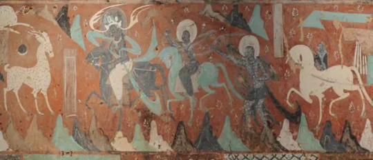 《郊游》敦煌莫高窟第257窟《鹿王本生圖》是北魏時期的作品,屬敦煌壁畫早期作品,其造型用線簡練概括,結構清晰合理,構圖長卷平鋪,色彩協調統一,具有中國傳統審美特點,從內容到表現手法都體現出中國傳統繪畫最基本的特征。