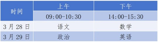 考生按照準(zhǔn)考證上的考點(diǎn)信息于2026年3月28日至29日參加文化考試。文化考試時間安排如下: