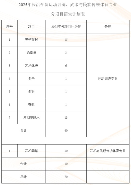 | 2025年長治學(xué)院運(yùn)動訓(xùn)練、武術(shù)與民族傳統(tǒng)體育專業(yè)分項目招生計劃表 |